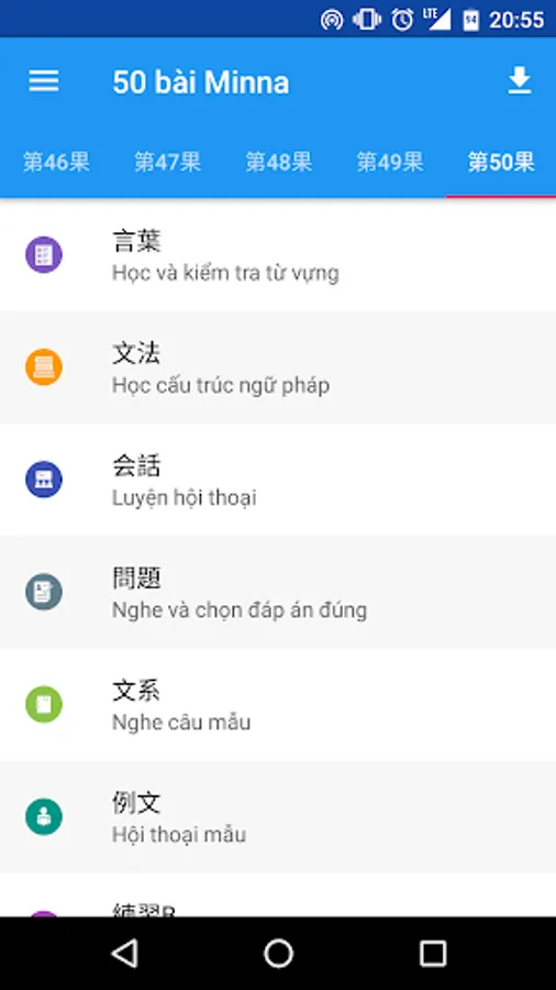 ∴Tron bo 50 bai minna: kotoba, bunpo, kaiwa, reibun, bunkei, renshuu b, renshuu c, mondai, tu vung tham khao.
