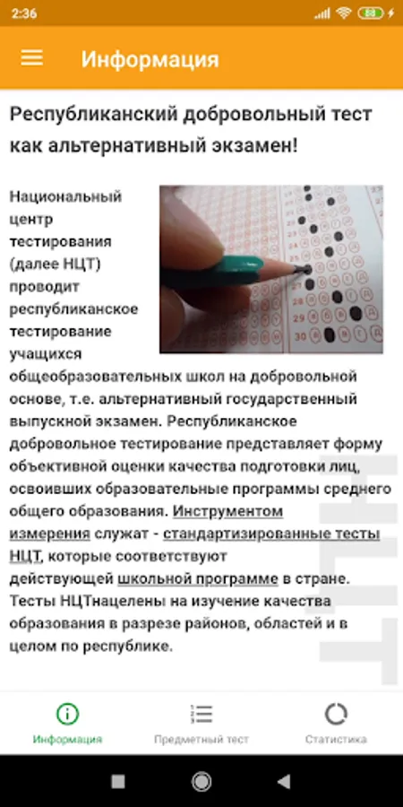 The ORT and NTTs application is intended to prepare for testing ORT and NTTs of secondary school students of the Kyrgyz Republic. The application includes everything you need to prepare for testing, for example, training materials, test statistics, as well as a simple test interface. For good preparation, the display of the correct answer is included, there is a timer showing the remaining time. The ORT and NTC application is not an absolutely effective preparation tool, therefore it is recommended to visit the official sites and centers for the preparation and testing of ORT and NTC.