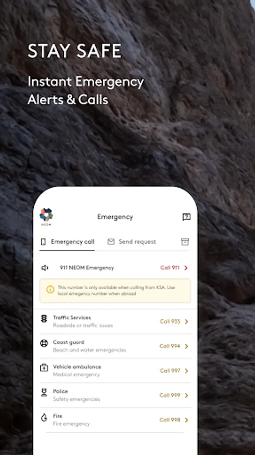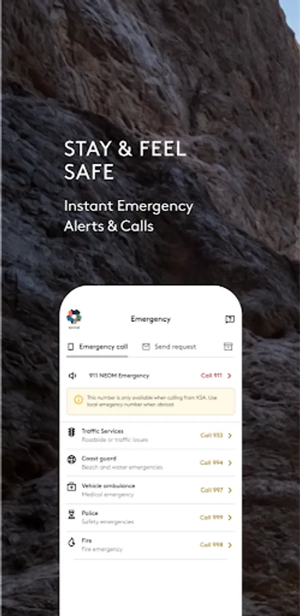 Emergency: Your safety is paramount. With our integrated emergency call function, you're always a tap away from assistance, ensuring peace of mind wherever you are in NEOM.