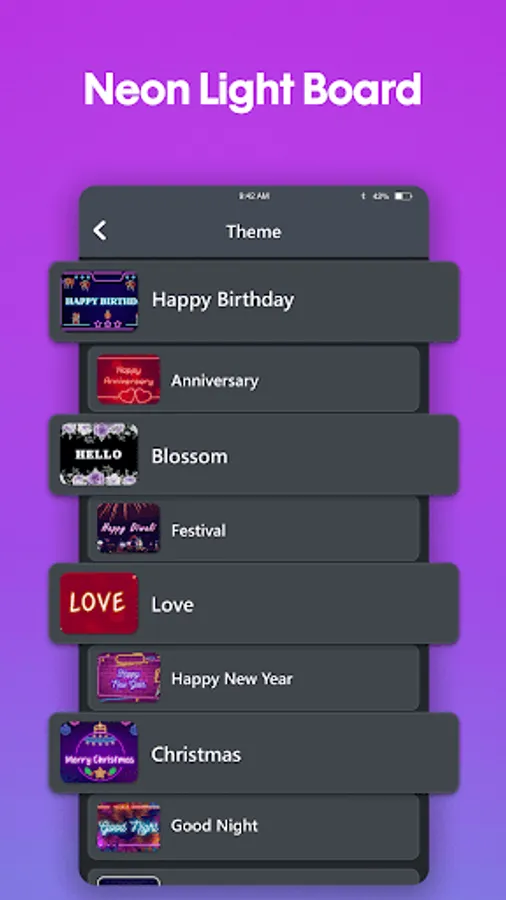 Neon Lightboard: Text Scroller gives a huge collection of themes category. In each category, there are different readymade led scrolling messages for bulletin boards.