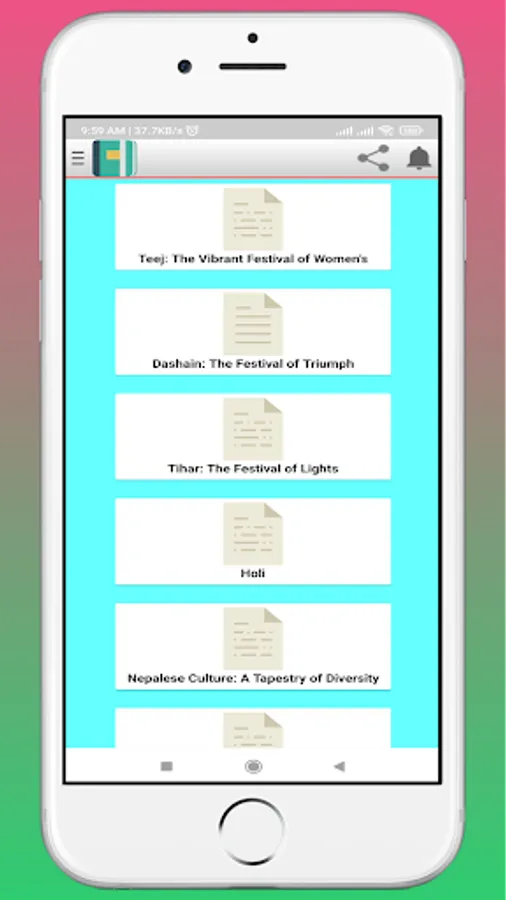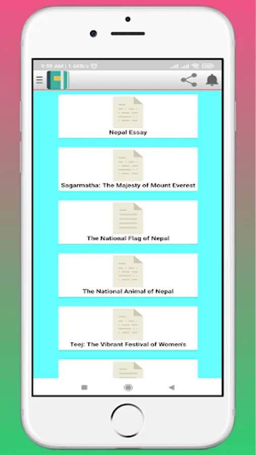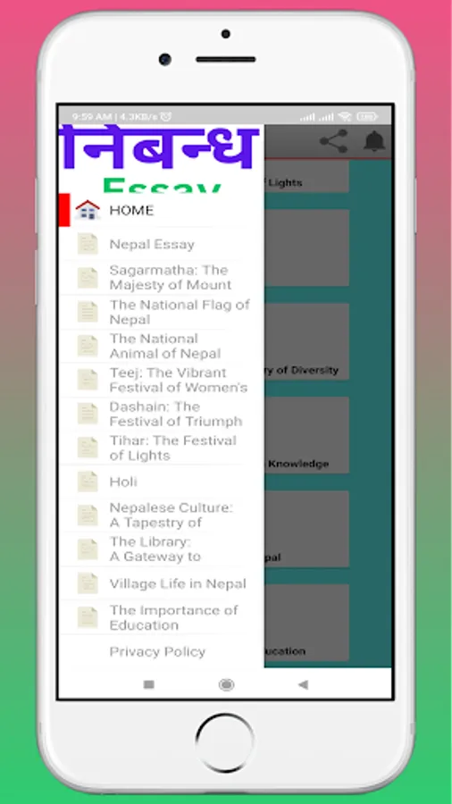 "Nepali Nibandh" is a user-friendly and comprehensive Nepali essay app designed to cater to the needs of Nepali language enthusiasts and students. With a vast collection of essays on various topics, this app serves as a valuable resource for individuals looking to improve their writing skills or seeking inspiration for academic assignments. The app offers a user-friendly interface, easy navigation, and a search feature to help users find essays based on their interests or specific requirements. Whether you are a student, a writer, or simply someone passionate about Nepali literature, "Nepali Nibandh" is the perfect companion to explore, learn, and enhance your knowledge of the Nepali language.