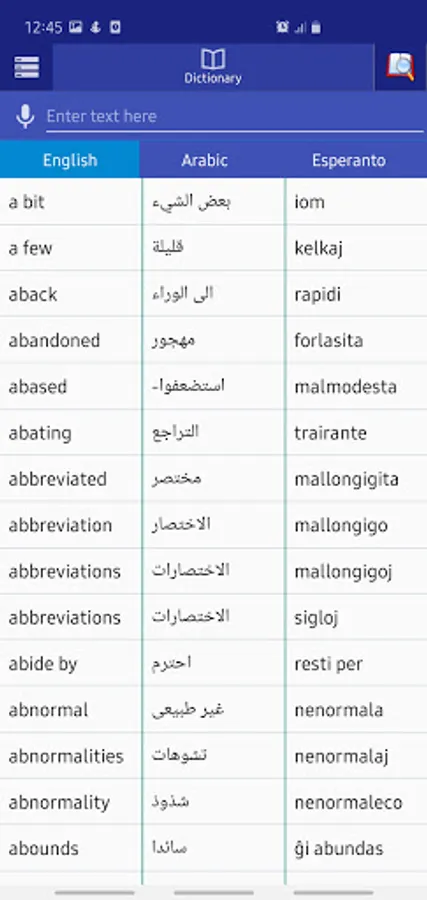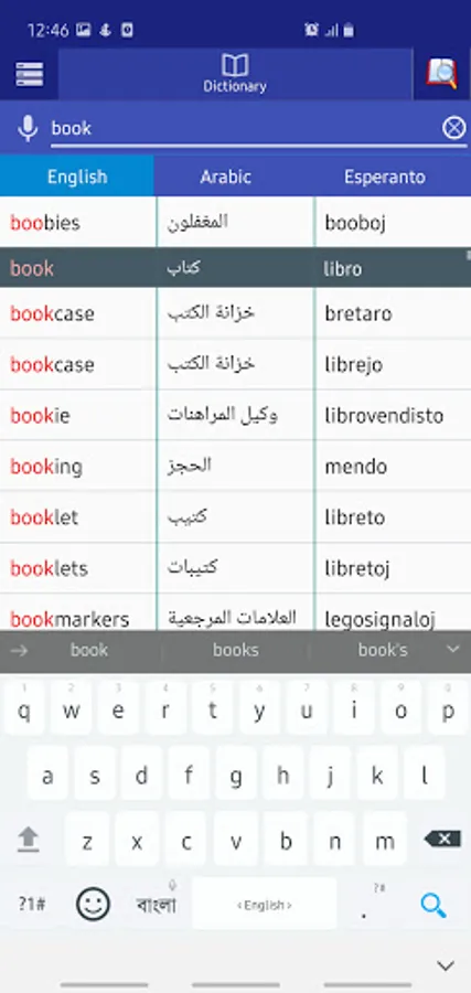 You can use this offline dictionary as learning tool. Browse words like a real dictionary book, search in English , Arabic and Esperanto.