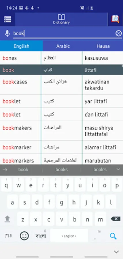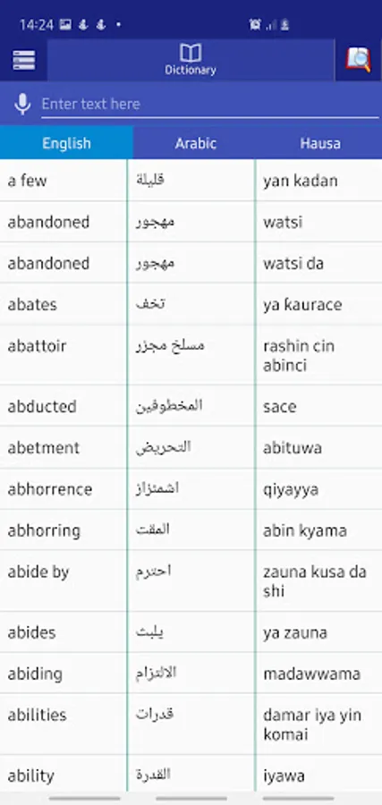 You can use this offline dictionary as learning tool. Browse words like a real dictionary book, search in English , Arabic and Hausa.