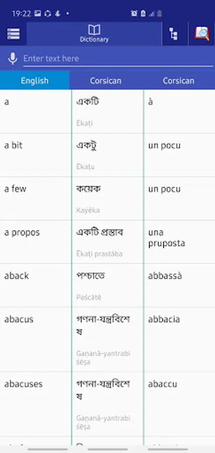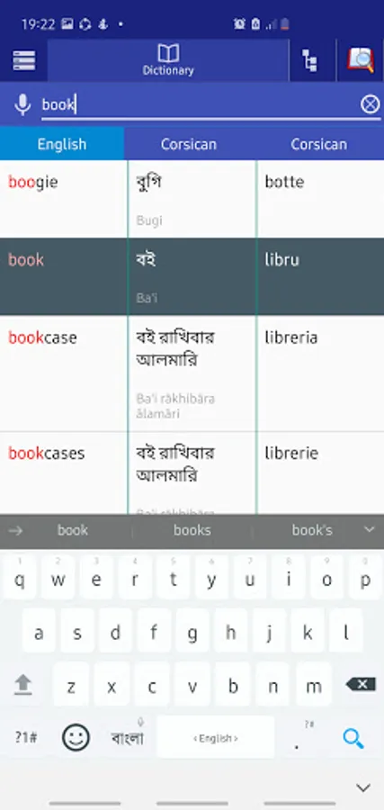 Support Bangla to Corsican Dictionary and Corsican to Bangla Dictionary, also support Bangla to English Dictionary and English to Bangla Dictionary, also support Corsican to English Dictionary and English to Corsican Dictionary.