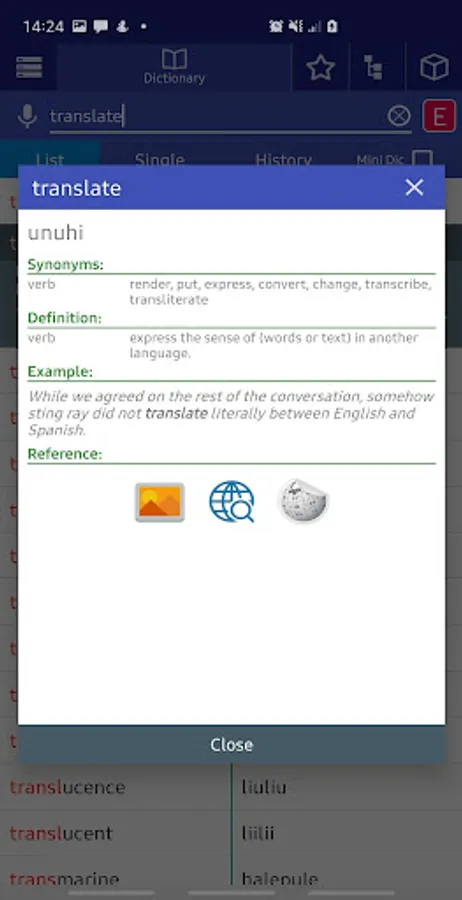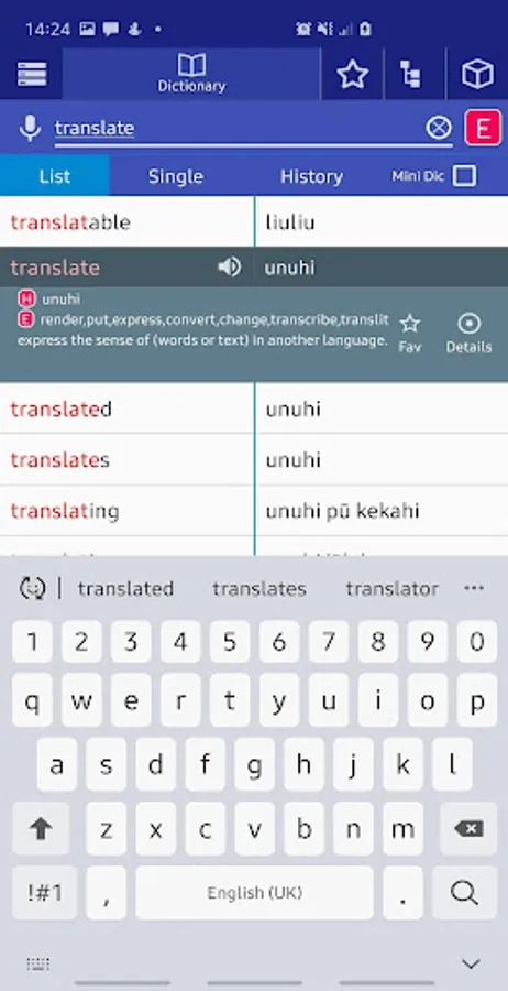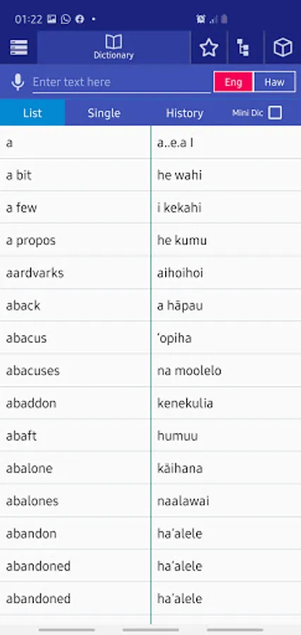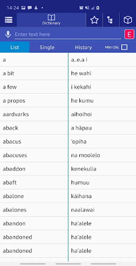 English <> Hawaiian Bi-directional Dictionary. You can use this offline dictionary as learning tool. Browse words like a real dictionary, search in English and Hawaiian, Words by category.