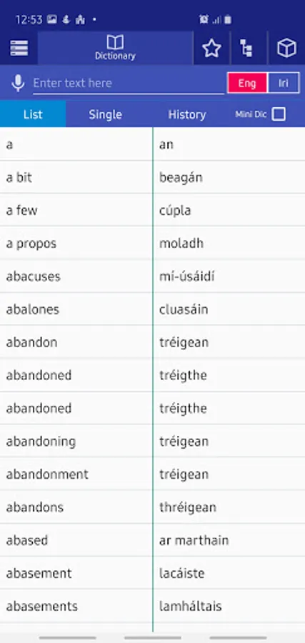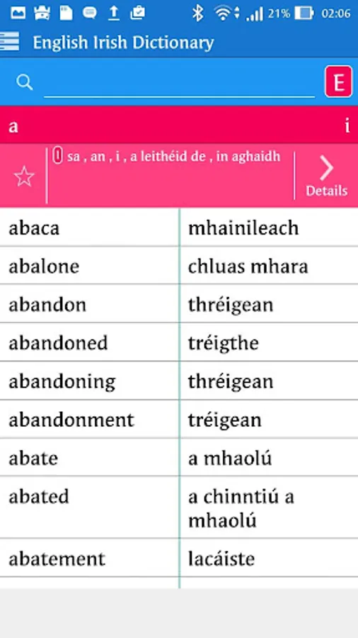 English <> Irish Bi-directional Dictionary. You can use this offline dictionary as learning tool. Browse words like a real dictionary, search in English and Irish, Words by category.