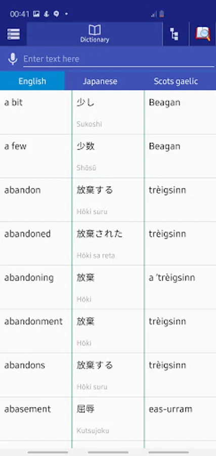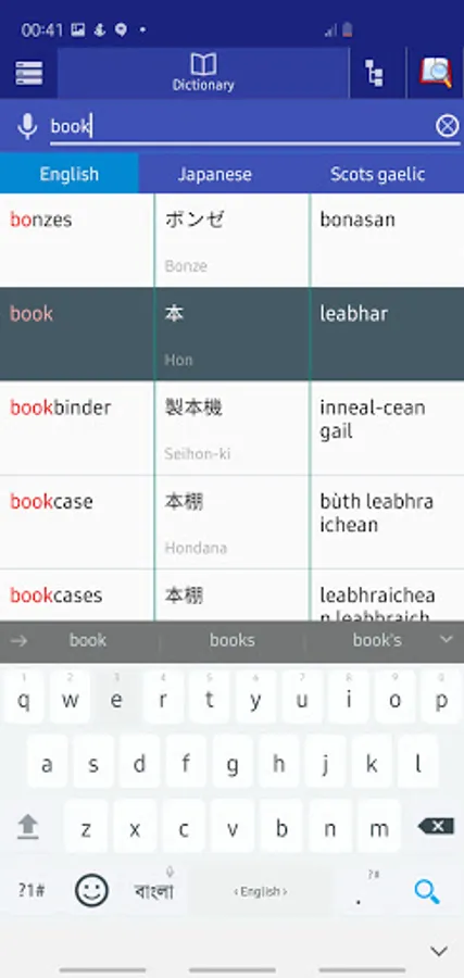 This dictionary support three language English, Scots gaelic and Japanese Dictionary.