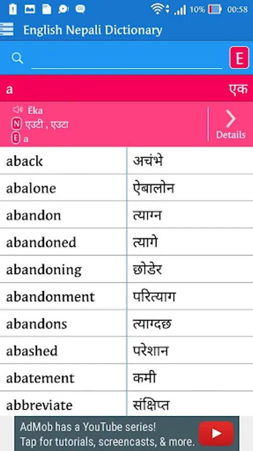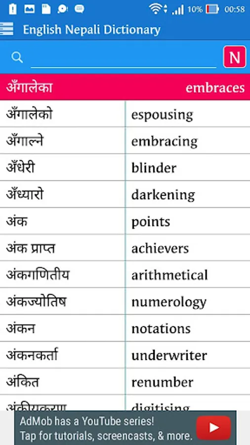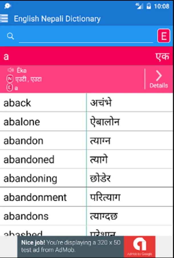 English <> Nepali Bi-directional Dictionary. You can use this offline dictionary as learning tool. Browse words like a real dictionary, search in English and Nepali, Words by category.
