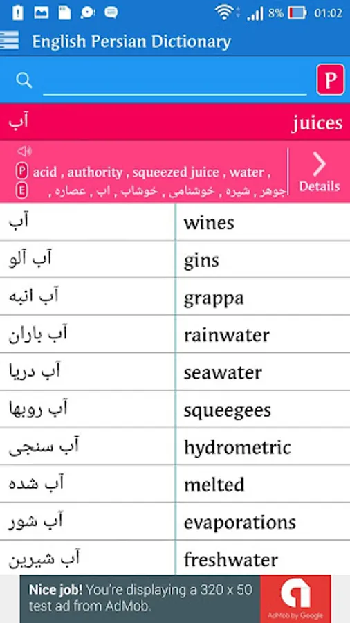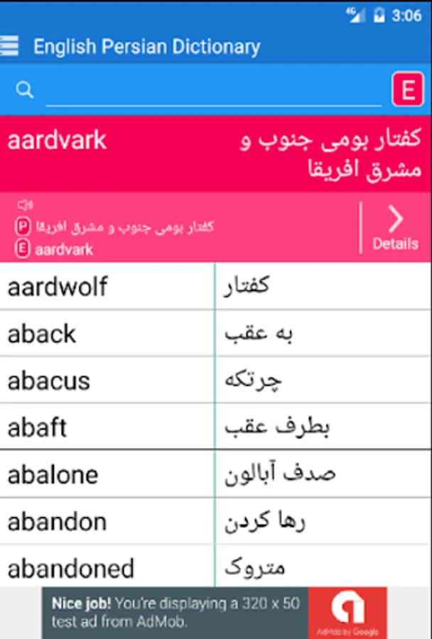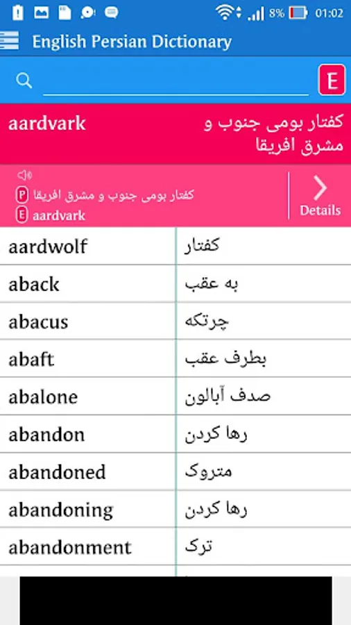 English <> Persian Bi-directional Dictionary. You can use this offline dictionary as learning tool. Browse words like a real dictionary, search in English and Persian, Words by category.