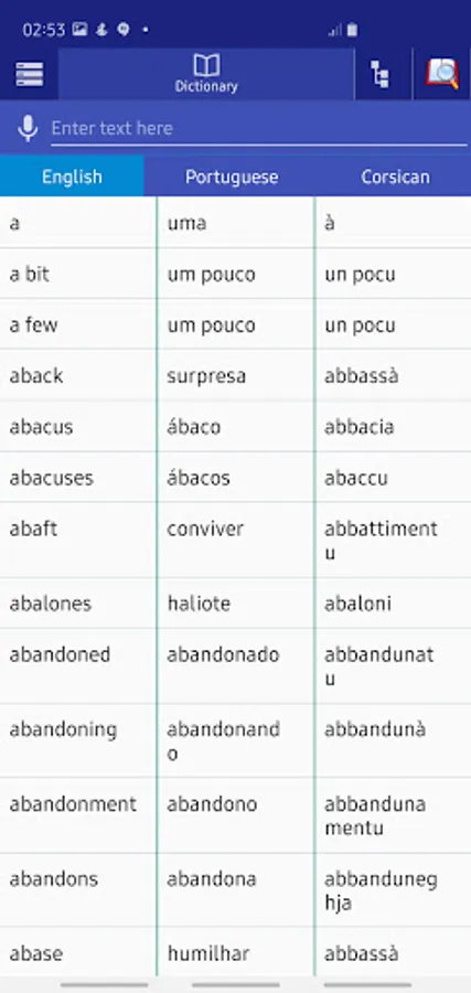You can use this offline dictionary as learning tool. Browse words like a real dictionary book. Search in English, Portuguese and Corsican.