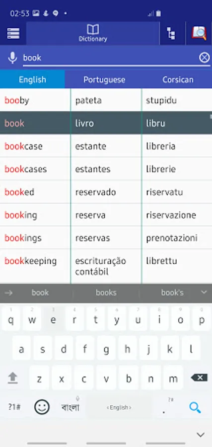 This dictionary support three language English, Corsican and Portuguese Dictionary.