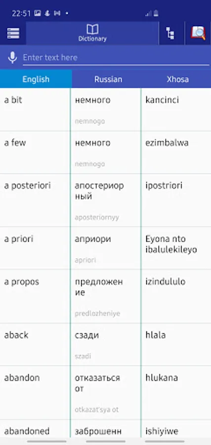 Support Russian to Xhosa Dictionary and Xhosa to Russian Dictionary, also support Russian to English Dictionary and English to Russian Dictionary, also support Xhosa to English Dictionary and English to Xhosa Dictionary.