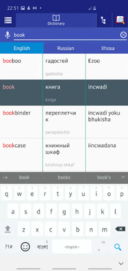 You can use this offline dictionary as learning tool. Browse words like a real dictionary book. Search in English, Russian and Xhosa.