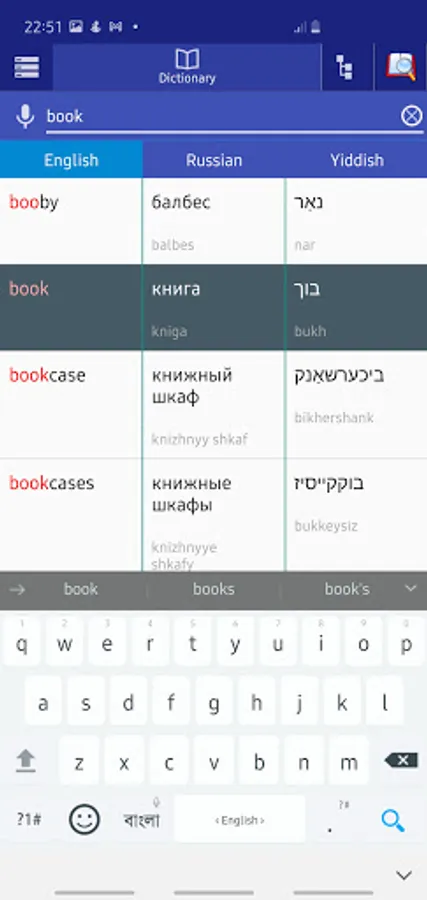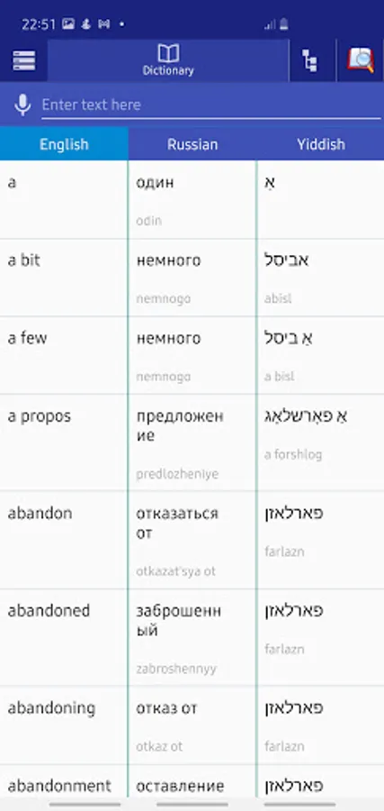 You can use this offline dictionary as learning tool. Browse words like a real dictionary book. Search in English, Russian and Yiddish.