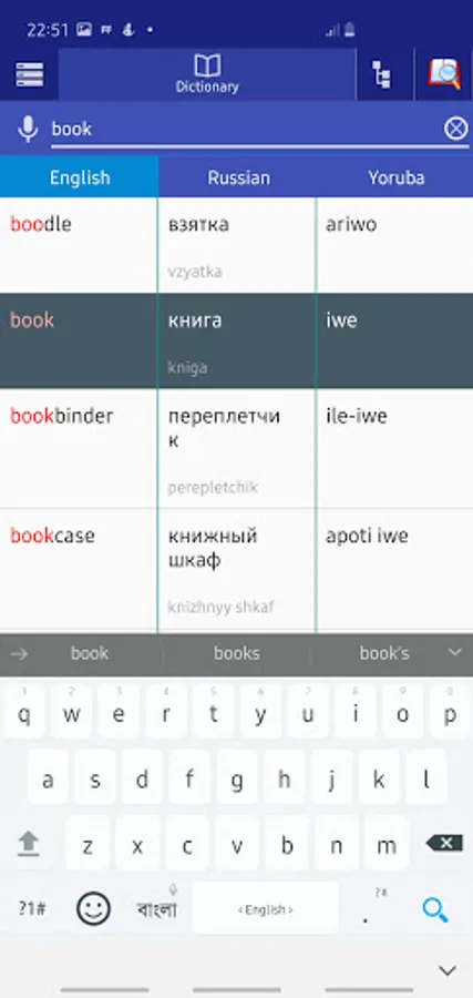 This dictionary support three language English, Yoruba and Russian Dictionary.