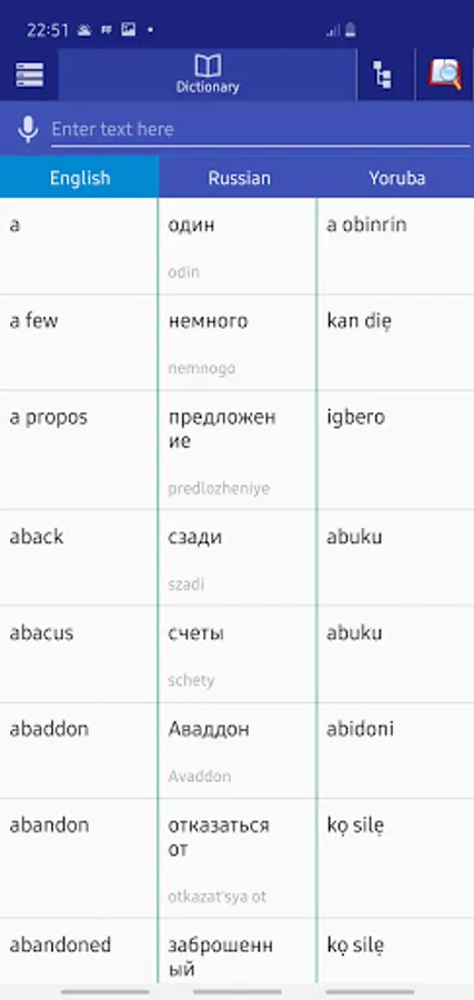 Support Russian to Yoruba Dictionary and Yoruba to Russian Dictionary, also support Russian to English Dictionary and English to Russian Dictionary, also support Yoruba to English Dictionary and English to Yoruba Dictionary.