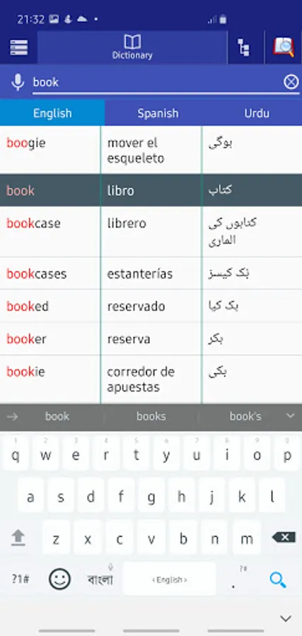 Support Spanish to Urdu Dictionary and Urdu to Spanish Dictionary, also support Spanish to English Dictionary and English to Spanish Dictionary, also support Urdu to English Dictionary and English to Urdu Dictionary.