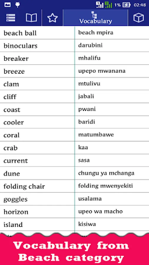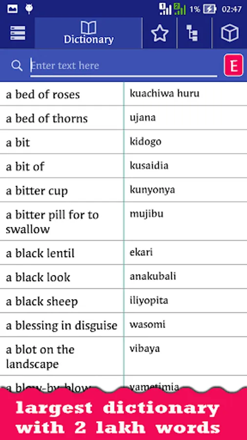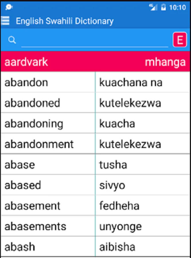 English <> Swahili Bi-directional Dictionary. You can use this offline dictionary as learning tool. Browse words like a real dictionary, search in English and Swahili, Words by category.
