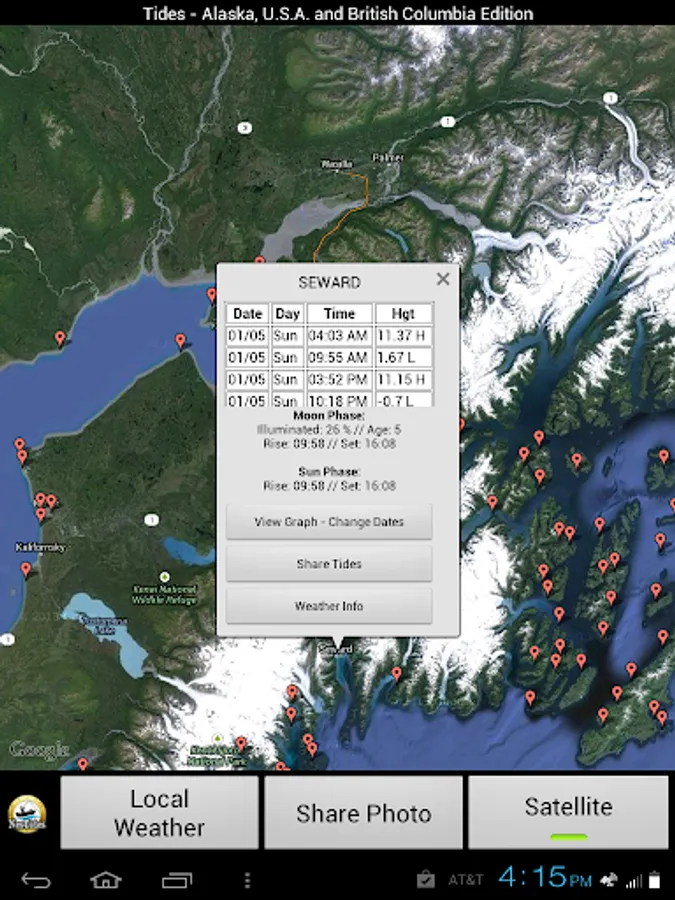 Accurate, simple to use Satellite Map based LIVE NOAA Alaska tide chart data for the entire Alaskan coastline on a simple to use satellite map.