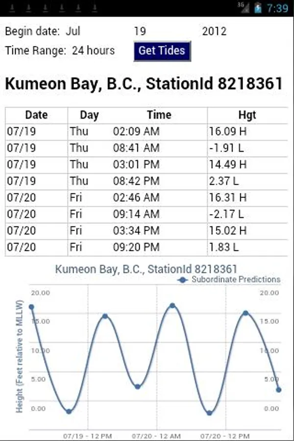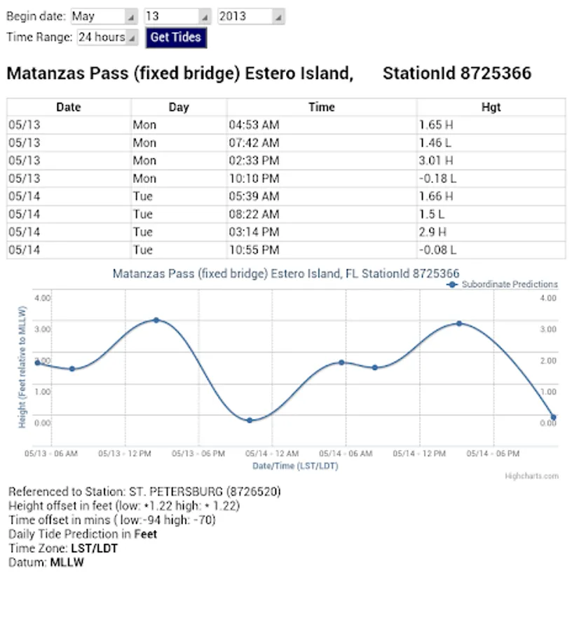 Ability to forecast tides from NOAA by setting date and period for any of the tidal stations for the entire State of Alaska tide tables.