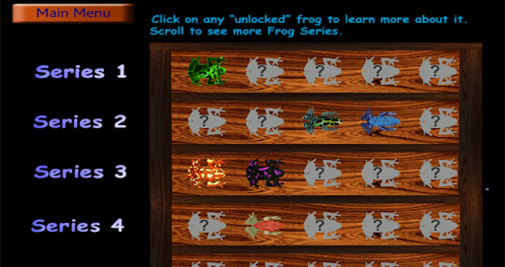 Over 25 frogs are based on real frogs. In the collection screen you can learn more about each frog, where they are found, what score each frog is worth and what level you found the frog in. The higher the frog has for points, the more you get for a higher score. The game has an arcade style play for achieving high scores but it also has a collectible aspect.