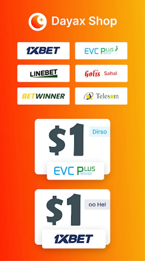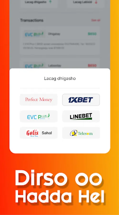 EvcPlus, Jeeb, E-Dahab, E-Sahal, Golis, 1Xbet iyo Perfect Money