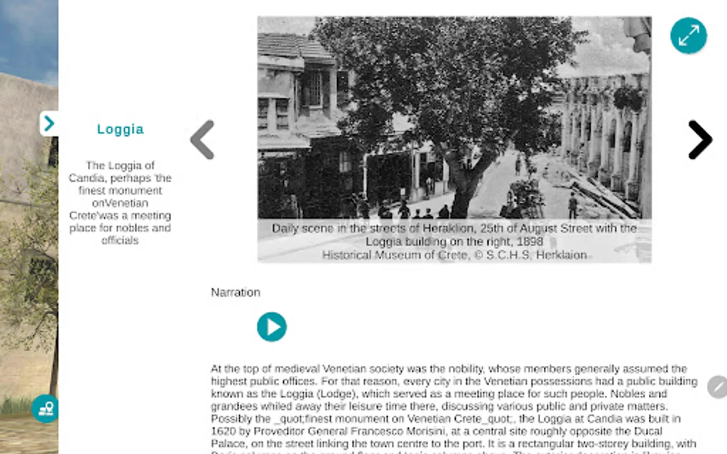 Through forty (40) 3d representations of buildings and the urban tissue of the Venetian period, the user gets a complete – as much as is possible - picture of 1640 Venetian Candia, a little before the Ottoman siege, conquest and domination. The administrative city centre (around the “Lions’ fountain”), the imposing buildings - palaces and government buildings- the magnificent churches and monasteries, the port with the fortress and the arsenals, the fortification walls with the renaissance gates, the elaborate fountains and many other monuments, appear on the screen of the smart mobile devices composing the image of a capital city of Venetian Crete, at its peak.