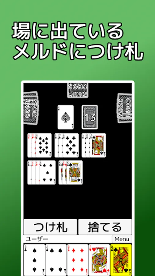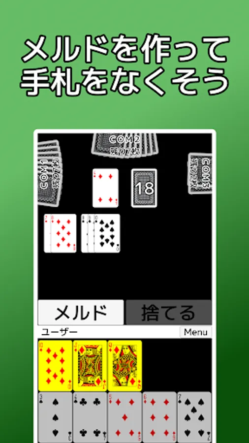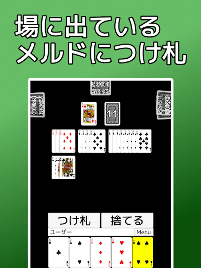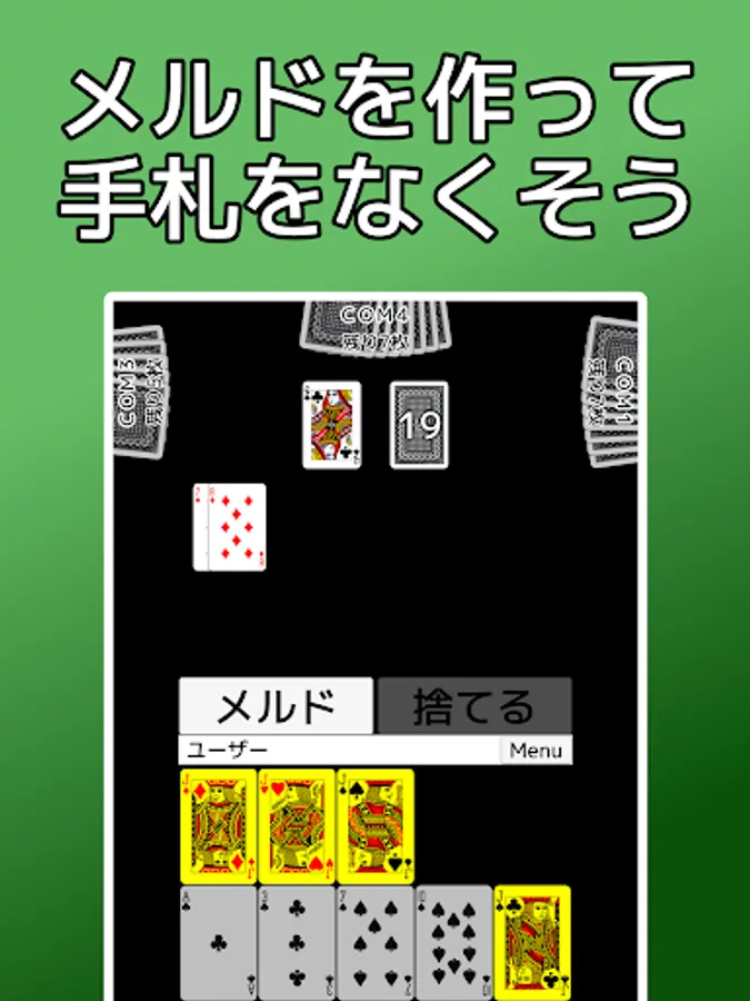 Compared to mahjong, there are only 7 cards in hand and 2 types of roles (meld), making it easy for beginners to play. When it goes up, the points are calculated from the other players' hands and the total becomes the score.