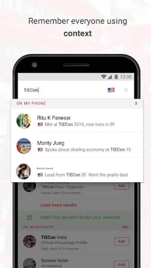 It is tough to remember names & everyone you met. We hear you! Use InTouch as your memory! Simply write a one liner about each contact you save - voila! Not only will you remember who the person is, you can also find the right person when you search.