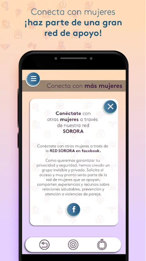 SORORA means brotherhood, support, respect and union between women. This application wants to be your ally to identify the presence and types of violence in your relationship, find out what actions you can take to stop or prevent them and connect with other women to share your experiences and give each other support.