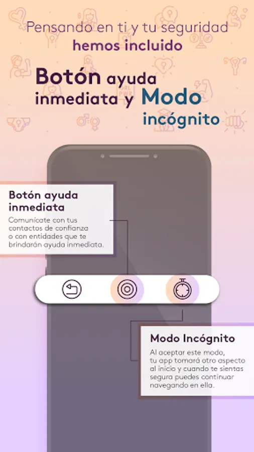 With your safety in mind we have included a panic button and incognito mode that will allow you to go to immediate help in case you find yourself in danger.