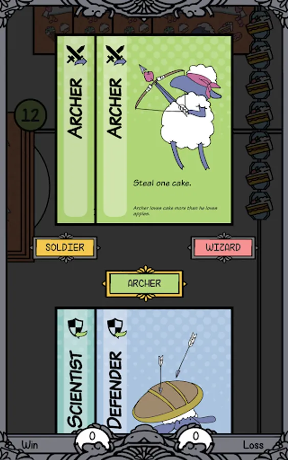In Cake Duel, players take turns attacking each other with Archer, Soldier and Wizard Sheepie while the defending player blocks with Defenders and Scientists.