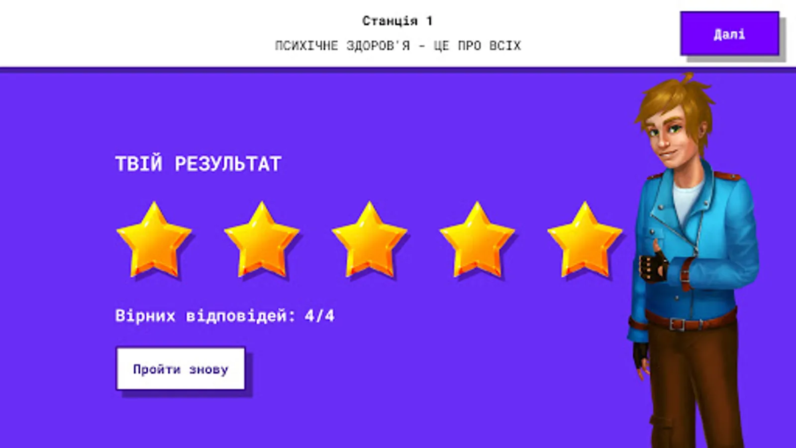 Поринь у цікаву та пізнавальну подорож самопізнання! На тебе чекає 5 захоплюючих станцій, протягом яких супроводжуватиме вірний друг – Макс. На кожній станції ти можеш переглянути відео, яке допоможе пройти квест. За вірні відповіді ти отримаєш зірочки.
