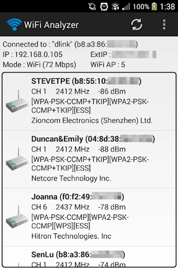- Display access point SSID, MAC, channel, frequency, signal strength, vender infomation.