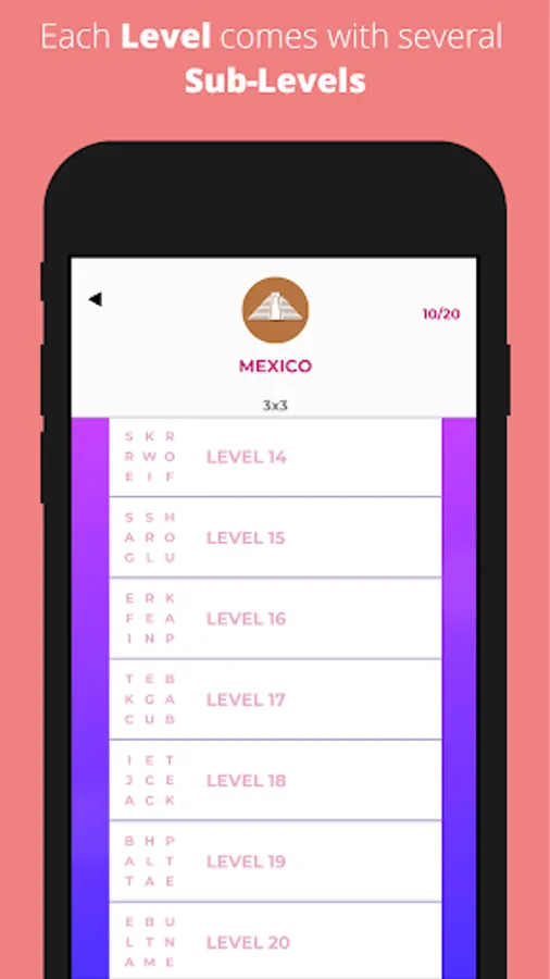 You will be required to swipe your finger horizontally, vertically, diagonally, forwards or backwards to find the specific hidden words in the letter grid. With more than 1200 well designed levels in 2x2, 3x3, 4x4, 5x5 and 6x6 format - be warned that the game may start easy but soon becomes difficult!