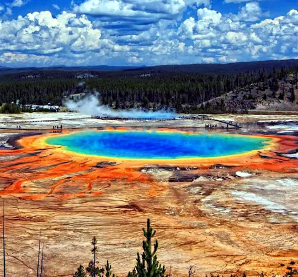 The vast natural forest of Yellowstone National Park covers nearly 9,000 km2 ; 96% of the park lies in Wyoming, 3% in Montana and 1% in Idaho. Yellowstone contains half of all the world's known geothermal features, with more than 10,000 examples. It also has the world's largest concentration of geysers (more than 300 geyers, or two thirds of all those on the planet). Established in 1872, Yellowstone is equally known for its wildlife, such as grizzly bears, wolves, bison and wapitis. (UNESCO n. 28)