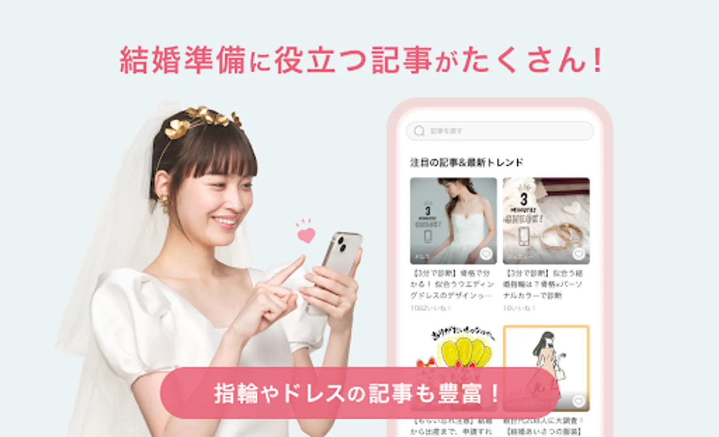 From wedding and new life preparation procedures and know-how to wedding style advice, dress and ring information, marriage procedures and notifications, and post-marriage human relationship etiquette articles. In addition to the true feelings of senior brides and guests, you can quickly collect information on the latest trends such as wedding (wedding) dresses, bridal hairstyles, and productions with photos and videos even when you are traveling for a short time! It's updated regularly so there's always something new to discover. You can search for keywords you care about from the search bar, and you can clip and share your favorite articles.