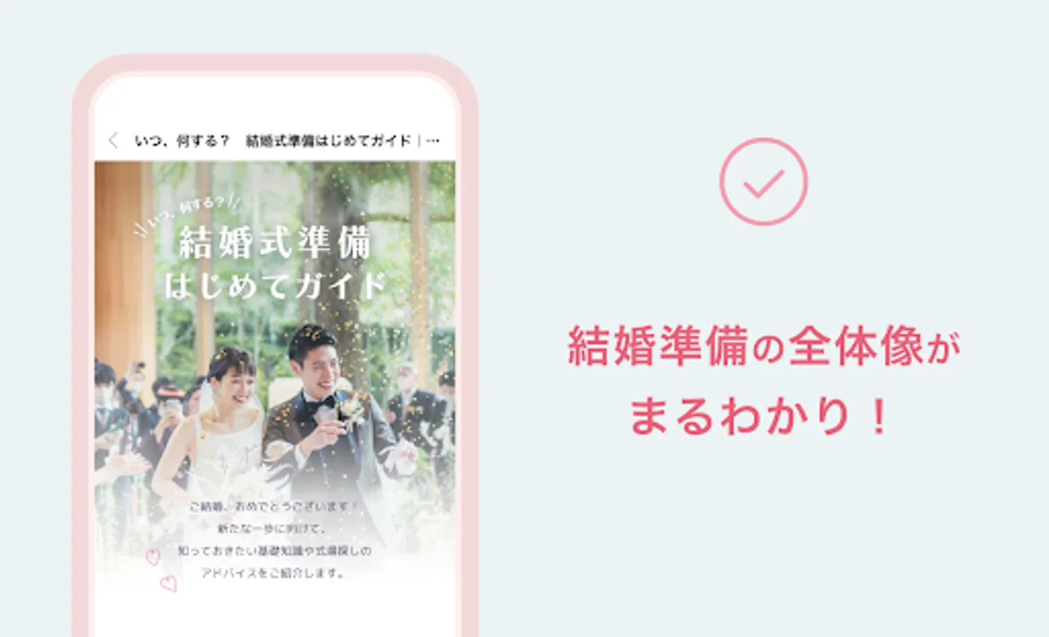 You can check not only the wedding but also the dandori and know-how of preparing for a new life by time. Everything you need to do is fully covered, and you can easily check your progress on the list, so you don't have to worry about missing anything! Moreover, there is also a countdown display of the number of days until the wedding ceremony, which will increase your mood until the day of the ceremony.