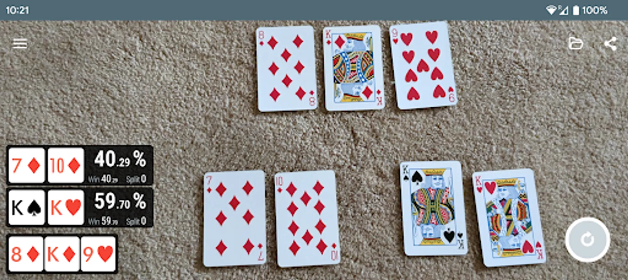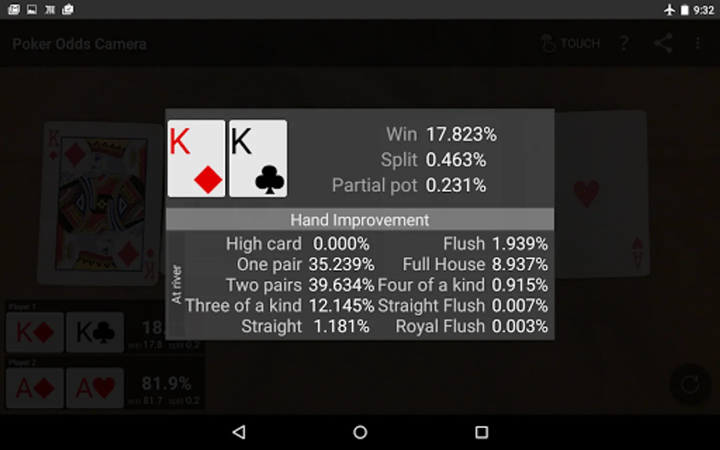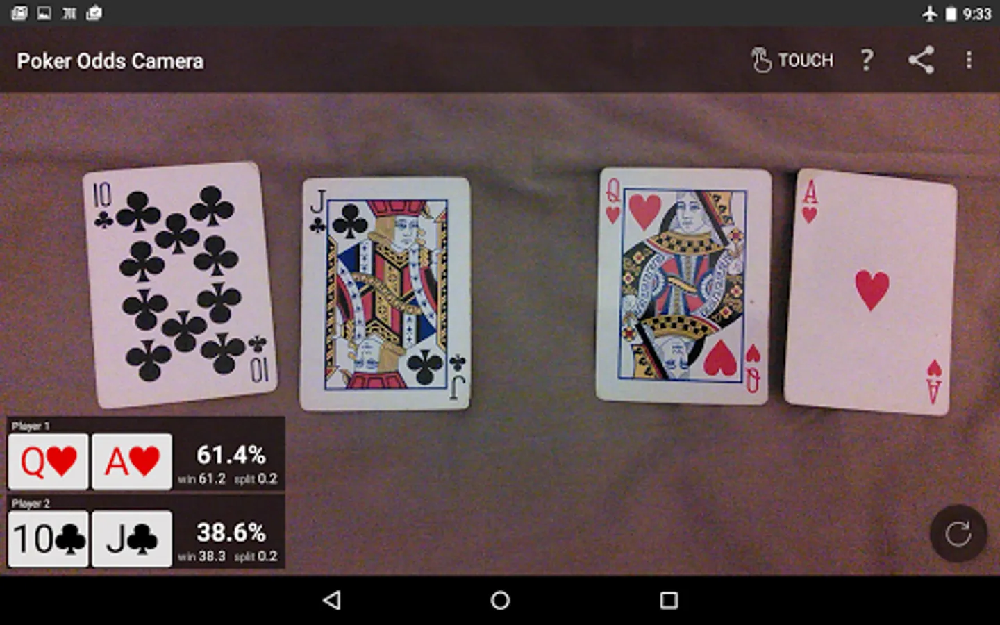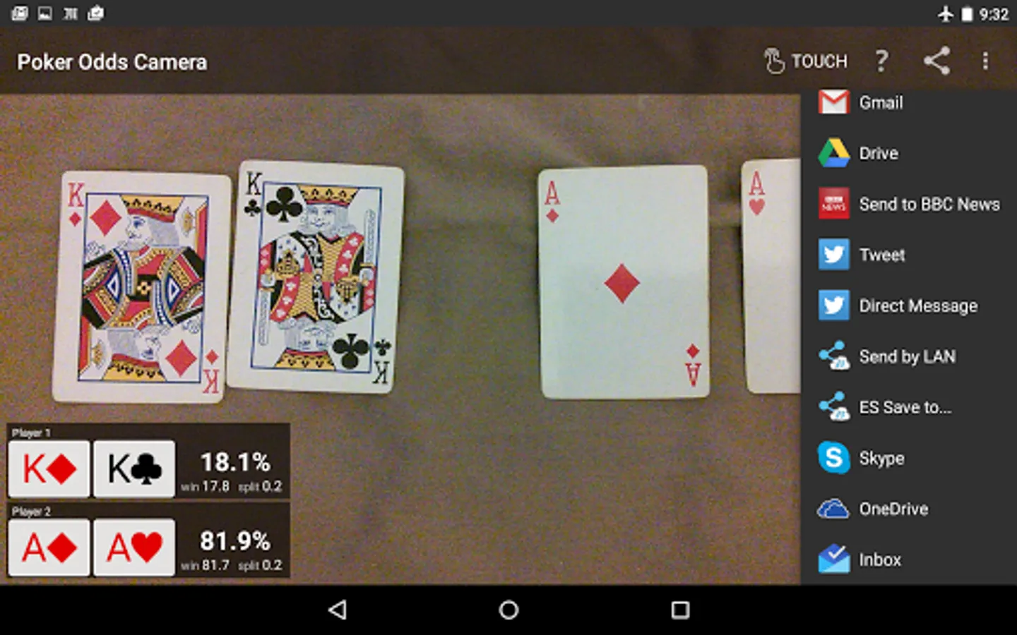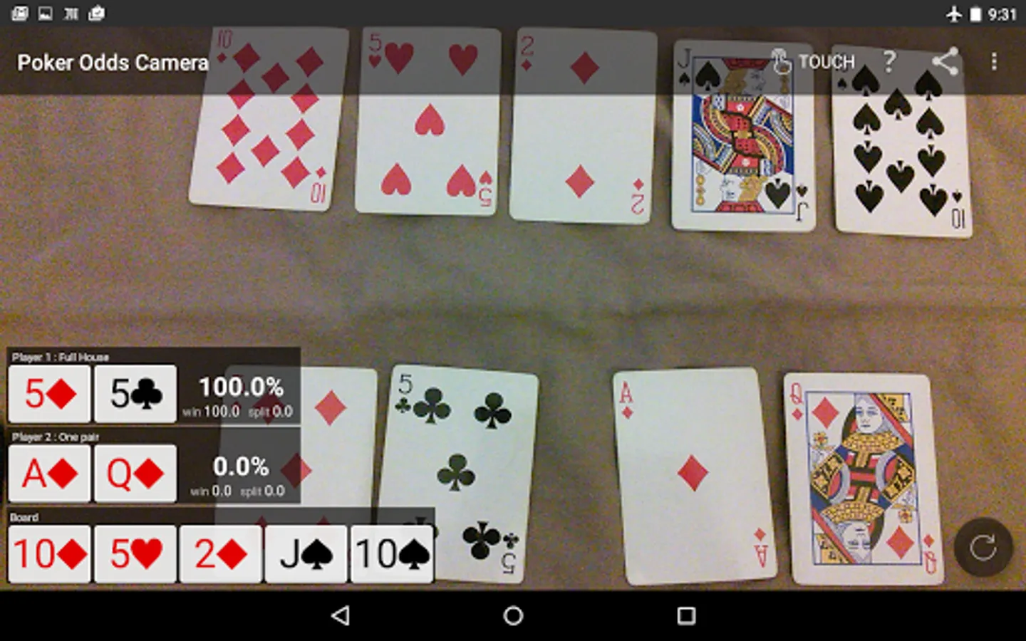 Poker Odds Camera is an application that recognizes a poker game via the camera and displays information about the game i.e. the odds and/or the value of each hand.