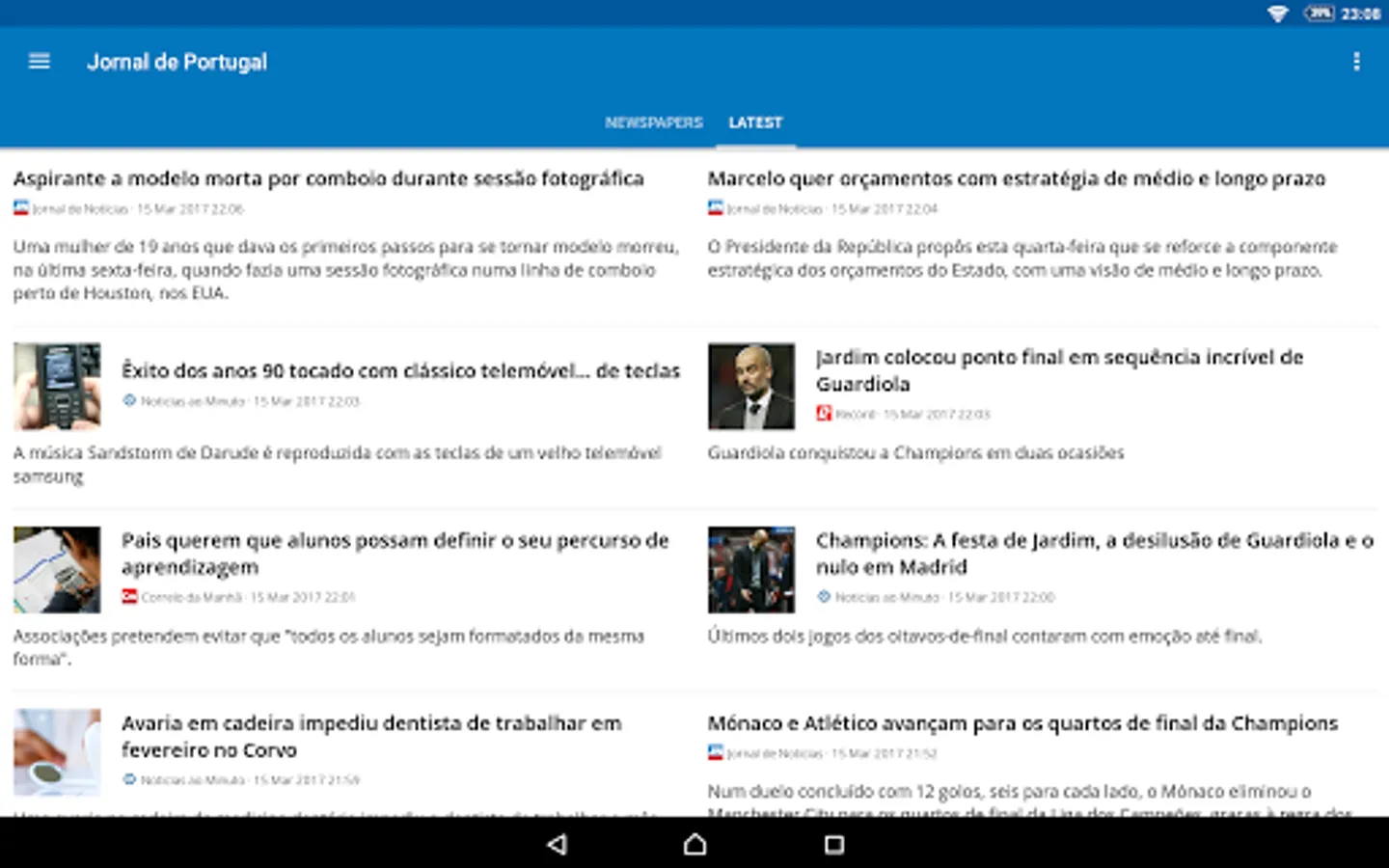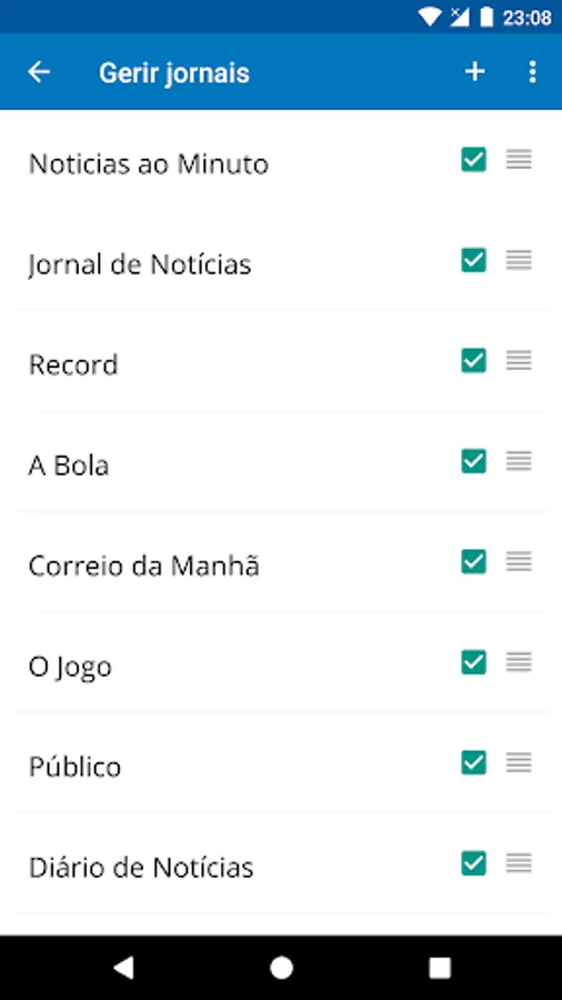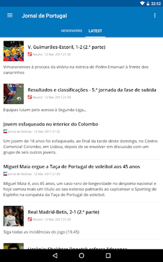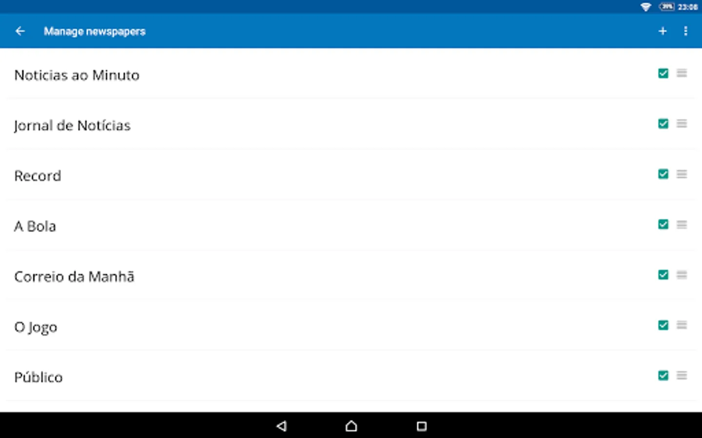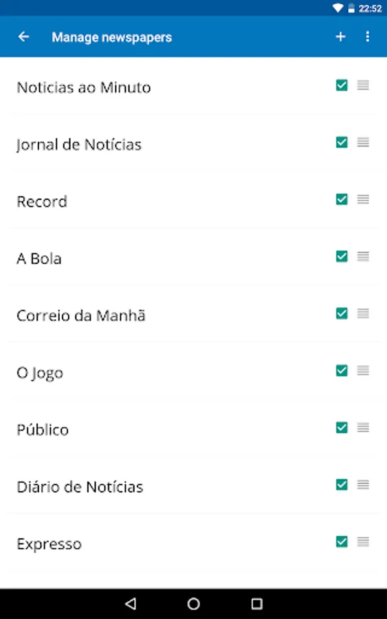 Available newspapers: A Bola, Noticias ao Minuto, Correio da Manhã, Record, Jornal de Notícias, O Jogo, Público, Caras, Mais Futebol, Diário de Notícias, Sol, Expresso, Jornal de Negócios, JM Madeira, Observador, Nova Gente, VIP, TVI24, Dinheiro Vivo, Jornal Económico, Visão, Notícias RTP, TechTuga, Futebol 365, Sábado, Euronews, Jornal i - ionline, Sapo, SIC Notícias, O Mirante, Diário de Coimbra, Exame Informática, TSF, Pplware, Renascença, Aquela Máquina, DNOTICIAS.PT, Correio do Minho, Activa, Diário do Minho, zerozero, Diário as Beiras, PT Jornal, Região de Leiria, Açoriano Oriental, IOL, Impala