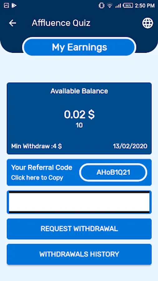 Affluence Quiz (AQ) Is an educational App Where you can answer questions and learn new things everyday. You also get an extra Live for every user you refer.