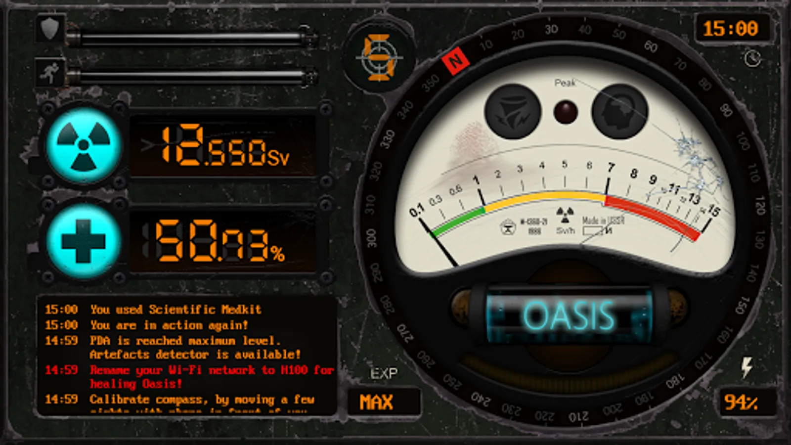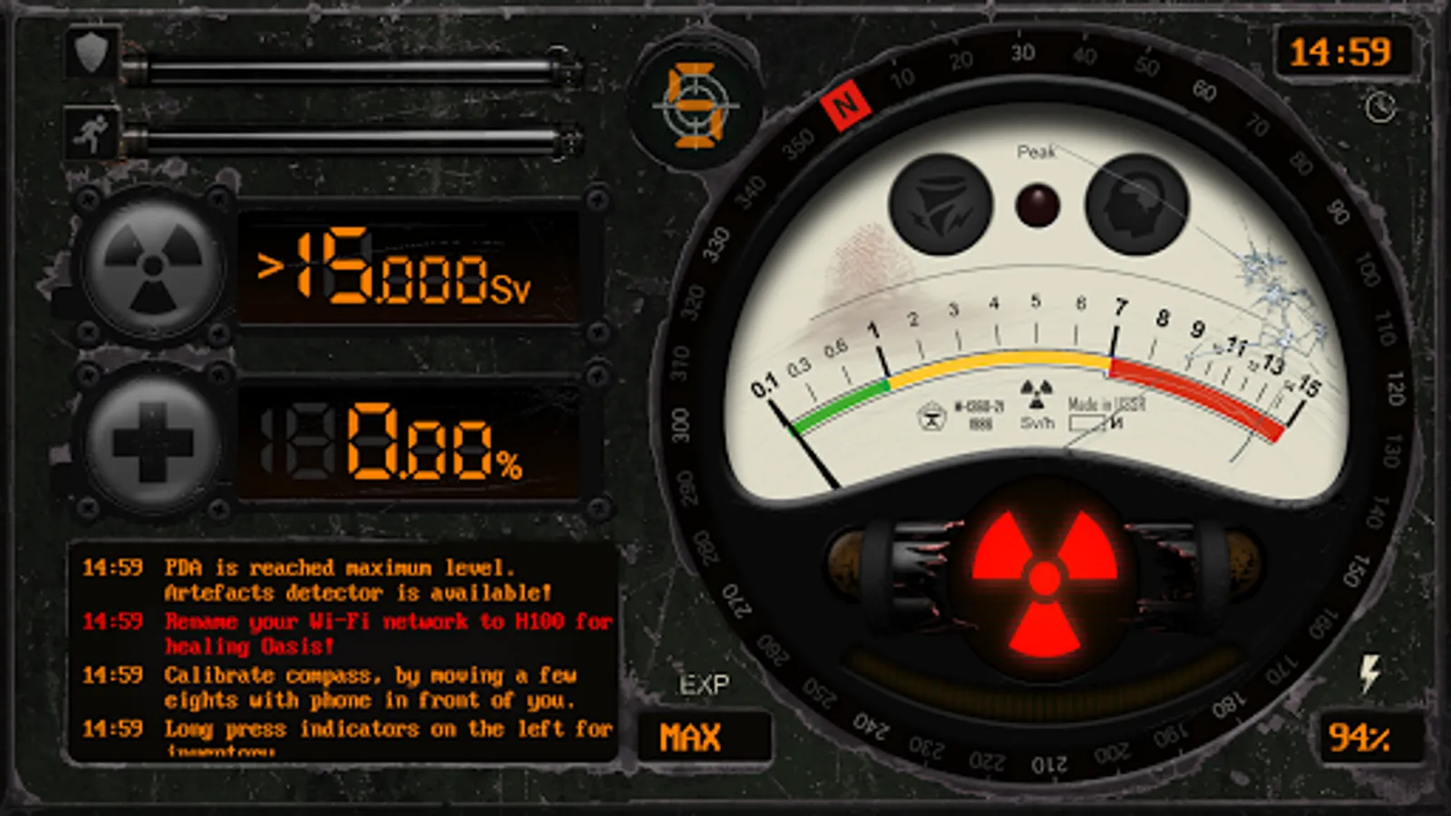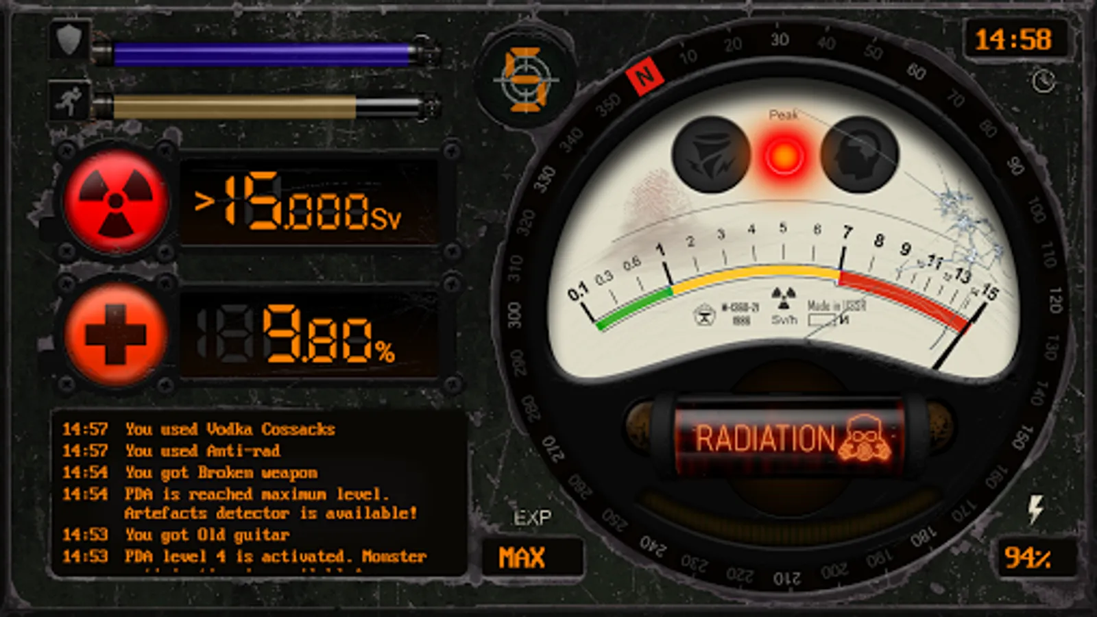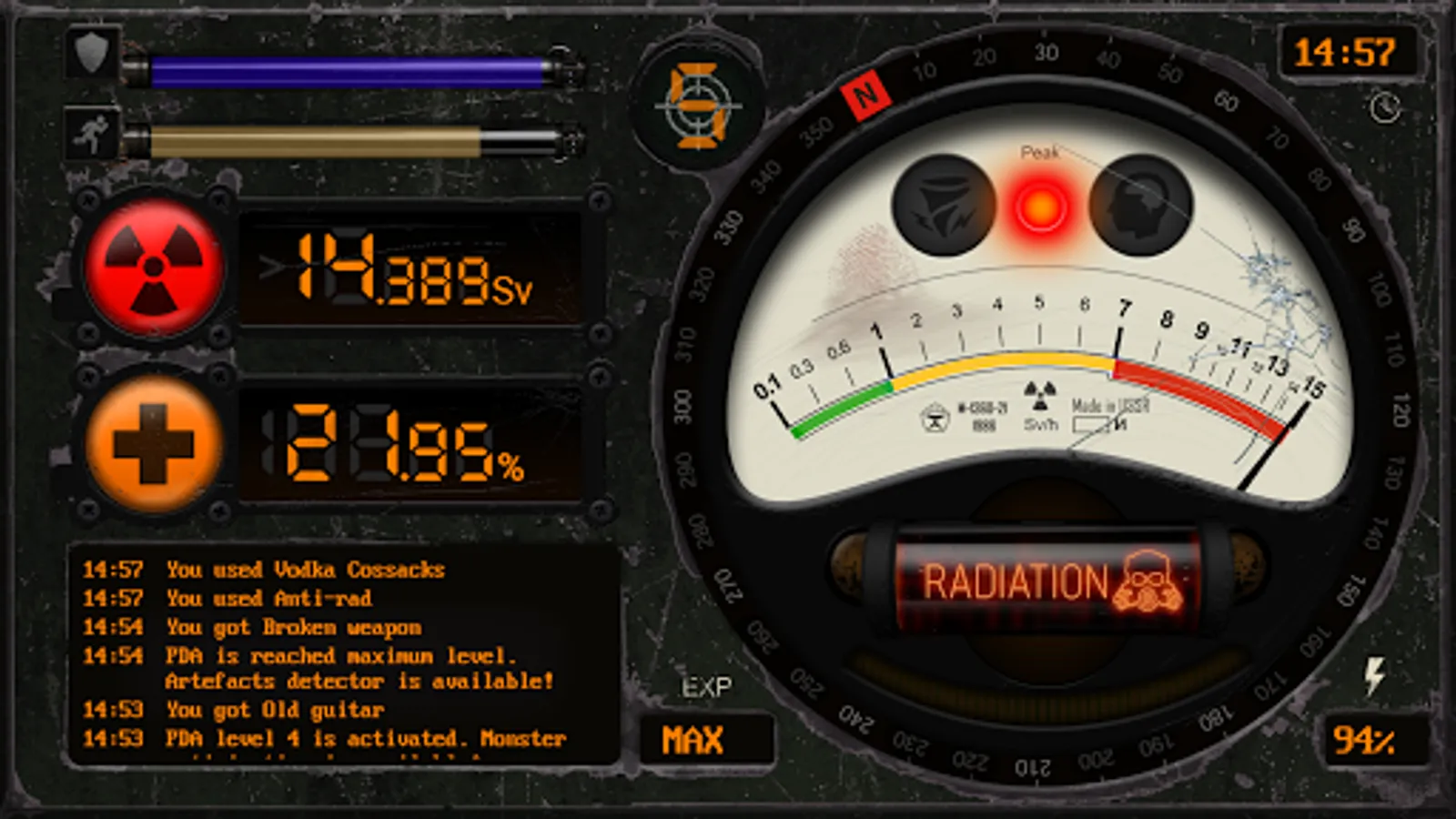 The main difference between PDA Compass and similar apps is the complete autonomy. For him, the Internet is not needed, all the data (parameters of life and accumulated radiation, experience, items in inventory, log messages, costumes and stimulants) are preserved even after the phone is restarted due to serialization and a local database.