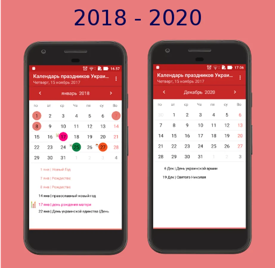 Calendar with public holidays in Ukraine in 2017 - 2020.