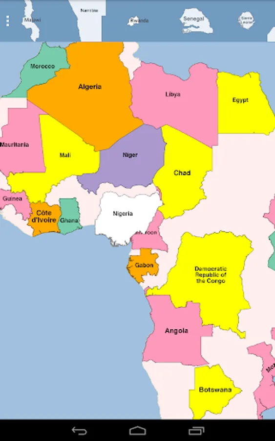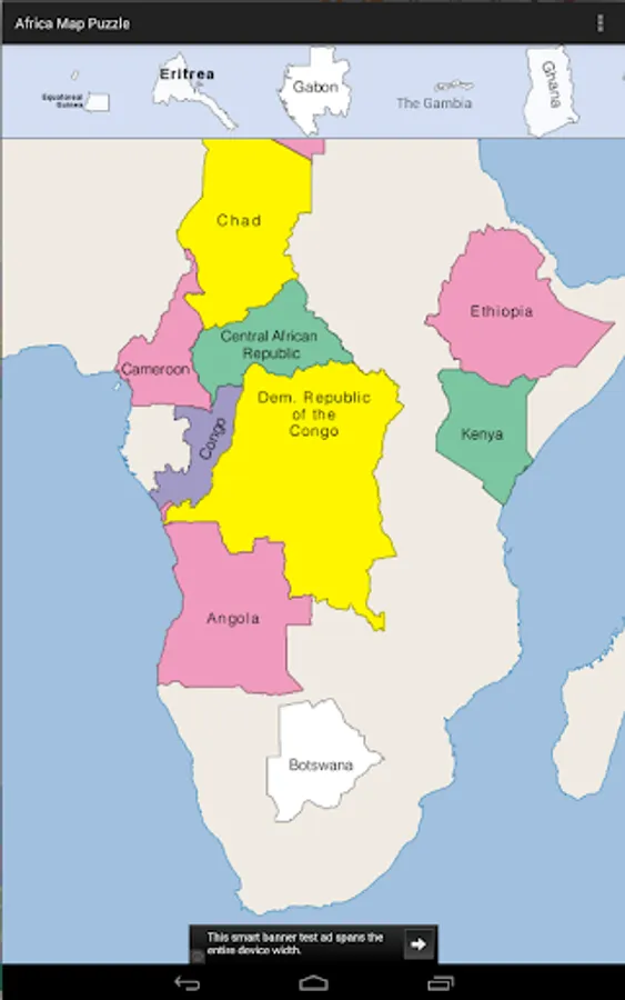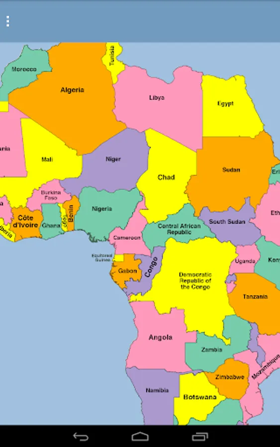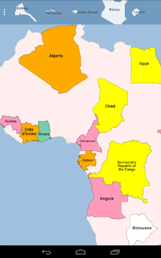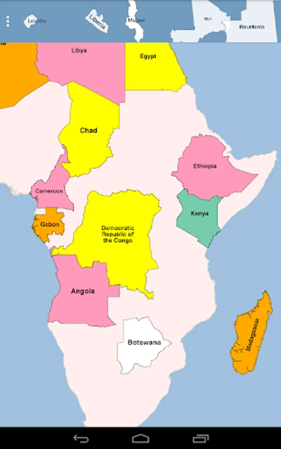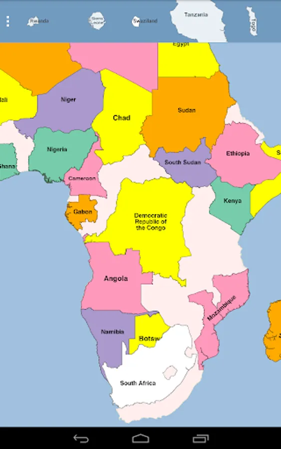This app is a puzzle of Africa, where each piece is the shape of a country. Drag and lock the pieces into place. Your progress is saved as you lock pieces. If you exit the app and restart, your locked pieces are restored.