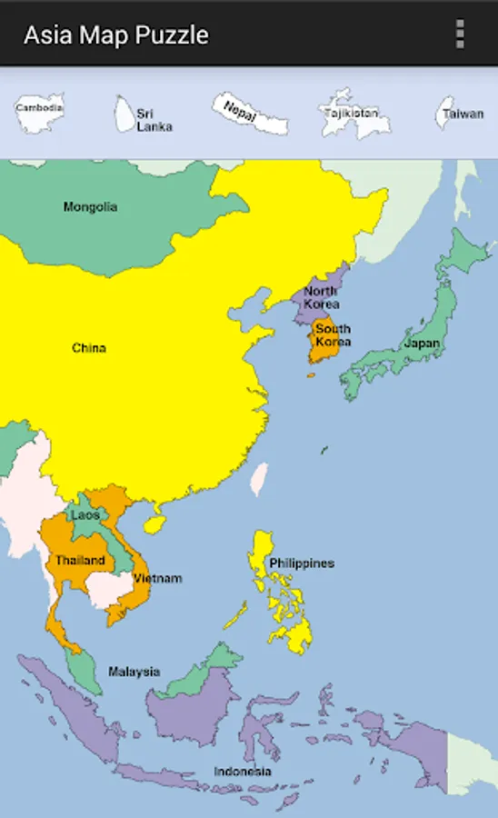 This app is a puzzle of Asia, where each piece is the shape of a country. Drag and lock the pieces into place. Your progress is saved as you lock pieces. If you exit the app and restart, your locked pieces are restored.