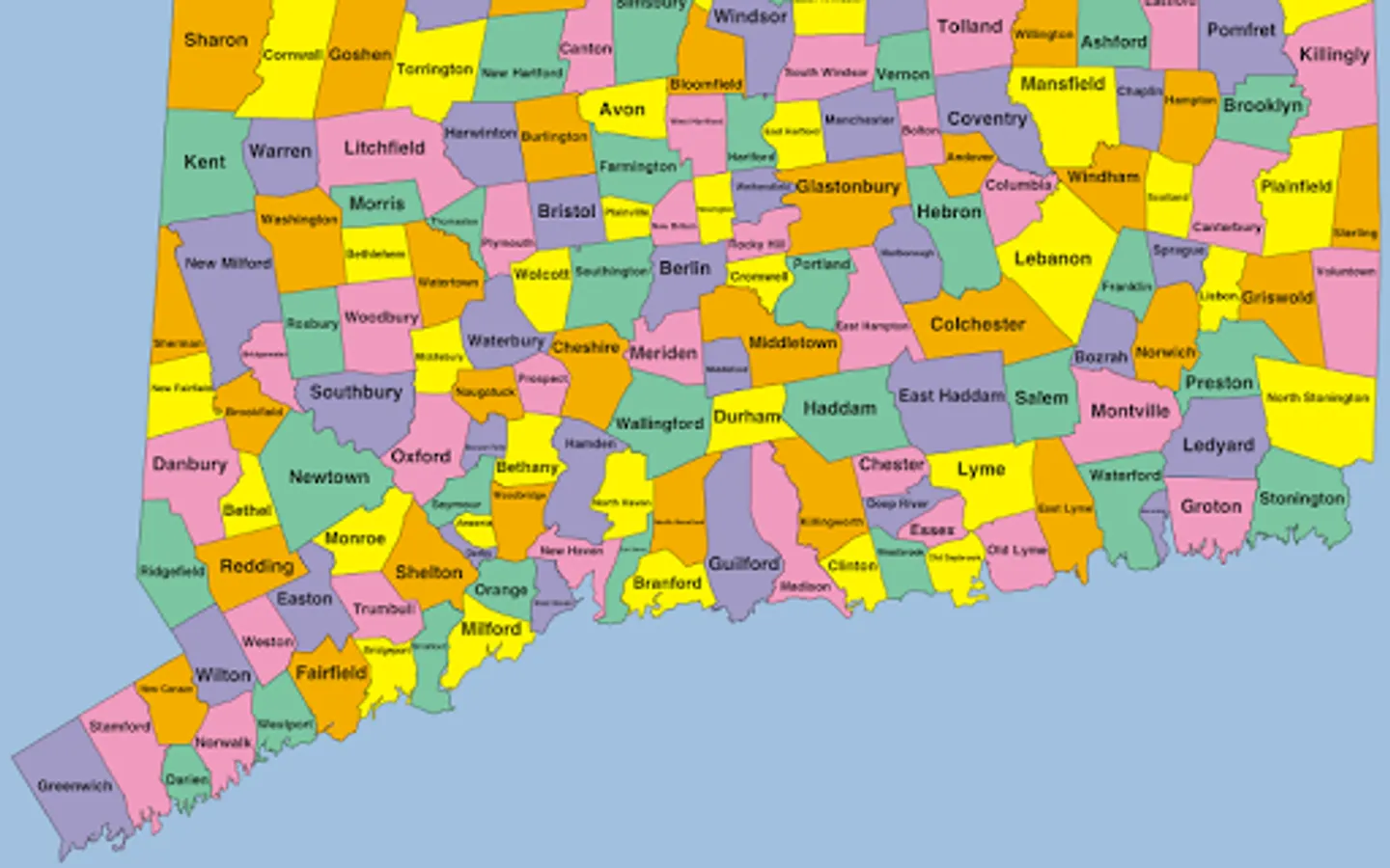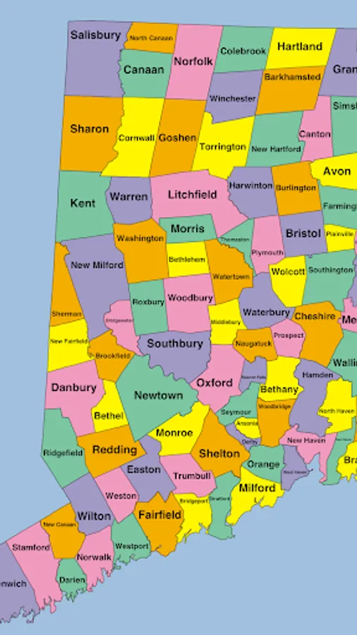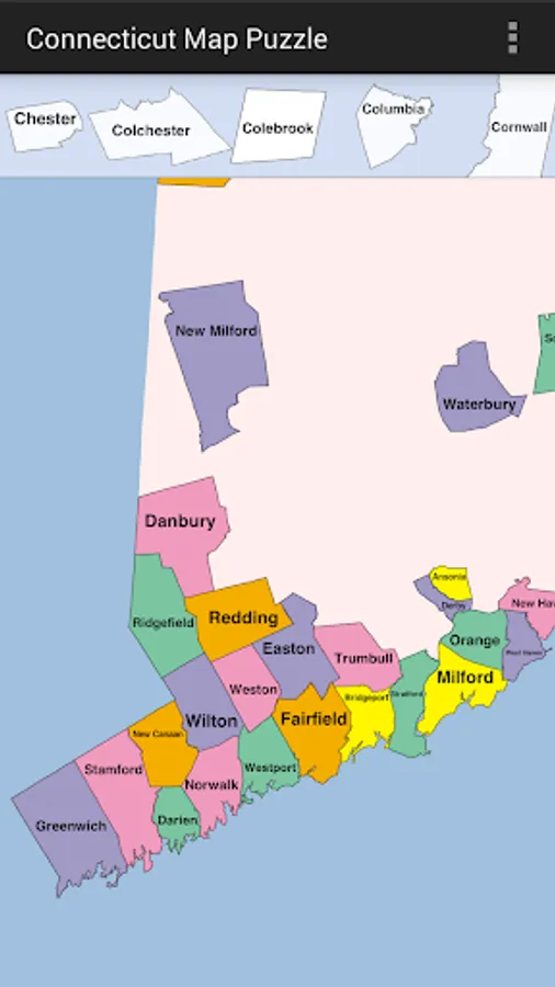 This app is a puzzle of Connecticut, where each piece is the shape of a town. Drag and lock the pieces into place. Your progress is saved as you lock pieces. If you exit the app and restart, your locked pieces are restored.