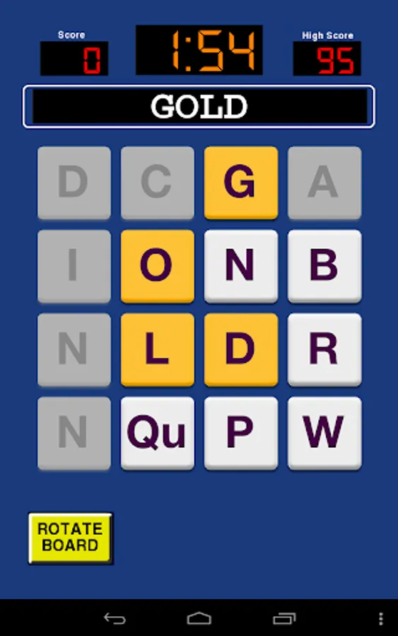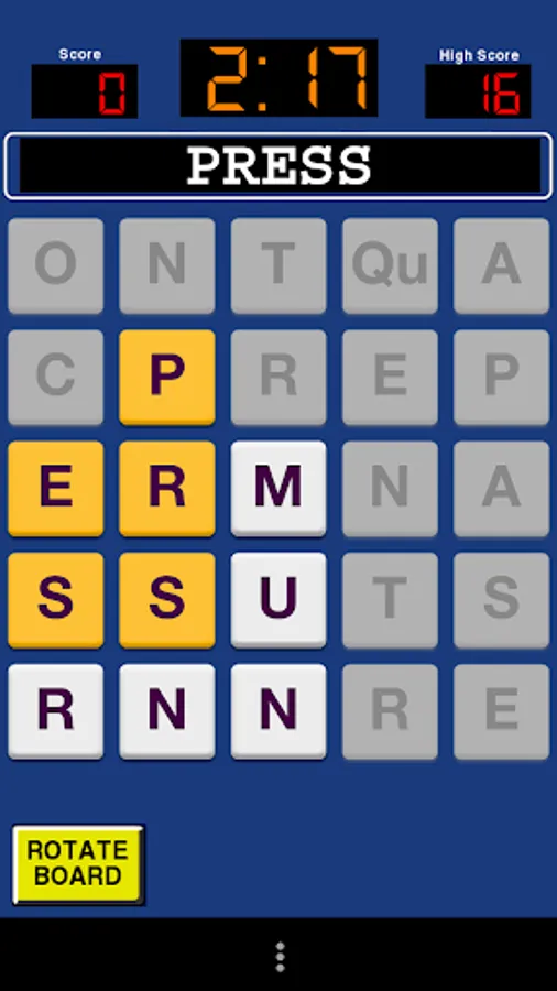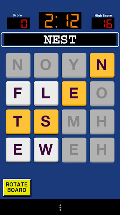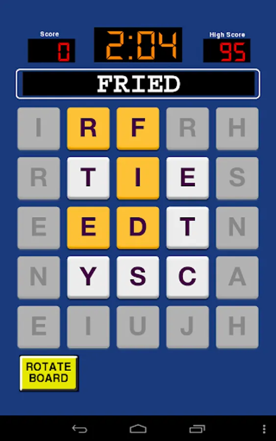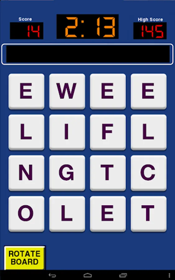 This game presents you with a grid of 4x4 or 5x5 of letters. Spell words by swiping the letters. Spell as many words as you can before time runs out.