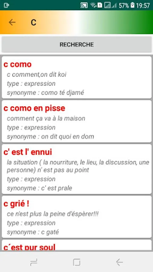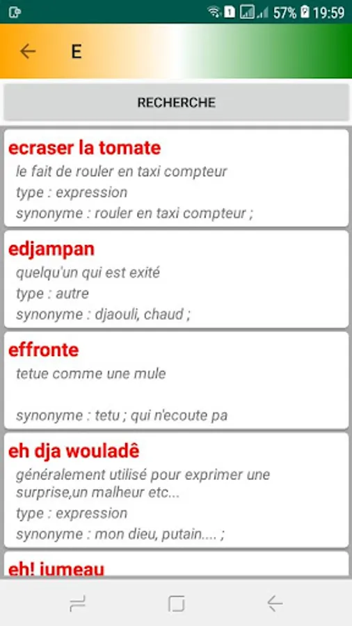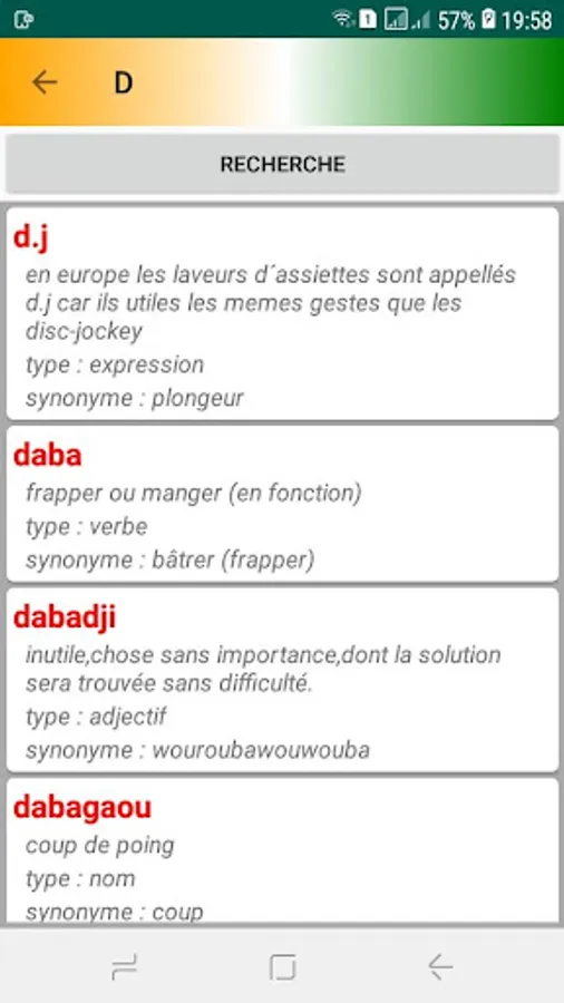 Nouchi is a language that is based on short sentences or additions of terms drawn from street experiences, English, French and Ivorian ethnic groups or even those of the West African sub-region. However, there are expressions specific to the nouchis and the ziguéhis (the bad-boys of the Abidjan ghettos) such as: "têguê", "gbôlô" or "daba le gaou" (beat up someone) "daba mon garba" (eat my attiéké with fried tuna fish); on the one hand "daba" or "gbolo" means "to strike, knock or defeat" and on the other hand, it means to eat.