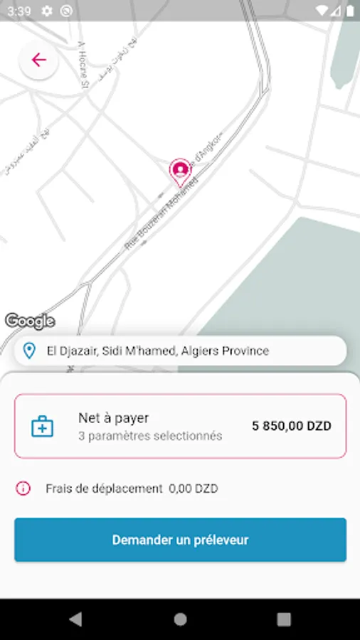 The application connects you with the sampler closest to you for a fast and efficient intervention at a lower cost. The visit of the nurse is totally free. (The application is available in Algiers only, other wilayas will follow)