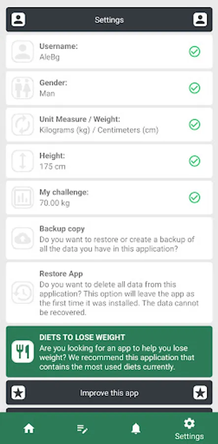 馃憠 Are you a person who tends to forget things? No problem, you can perfectly set up notifications so you don't forget meal times or update your weight log. Want to switch devices and don't want to lose your progress data? This application has a totally free tool with which you can create backup copies of all your data whenever you want.